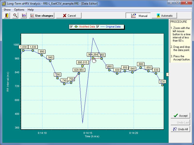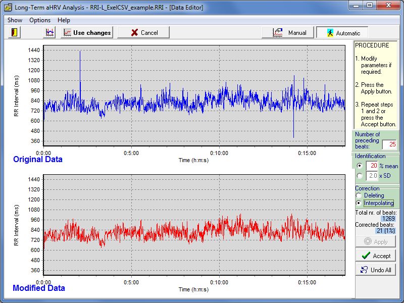 | Premature heart beats can be edited out of RRI files manually or automatically. The number of preceding beats on which correction is based, the parameters defining abnormal beats and the method of correction (deletion, interpolation) can be selected. |